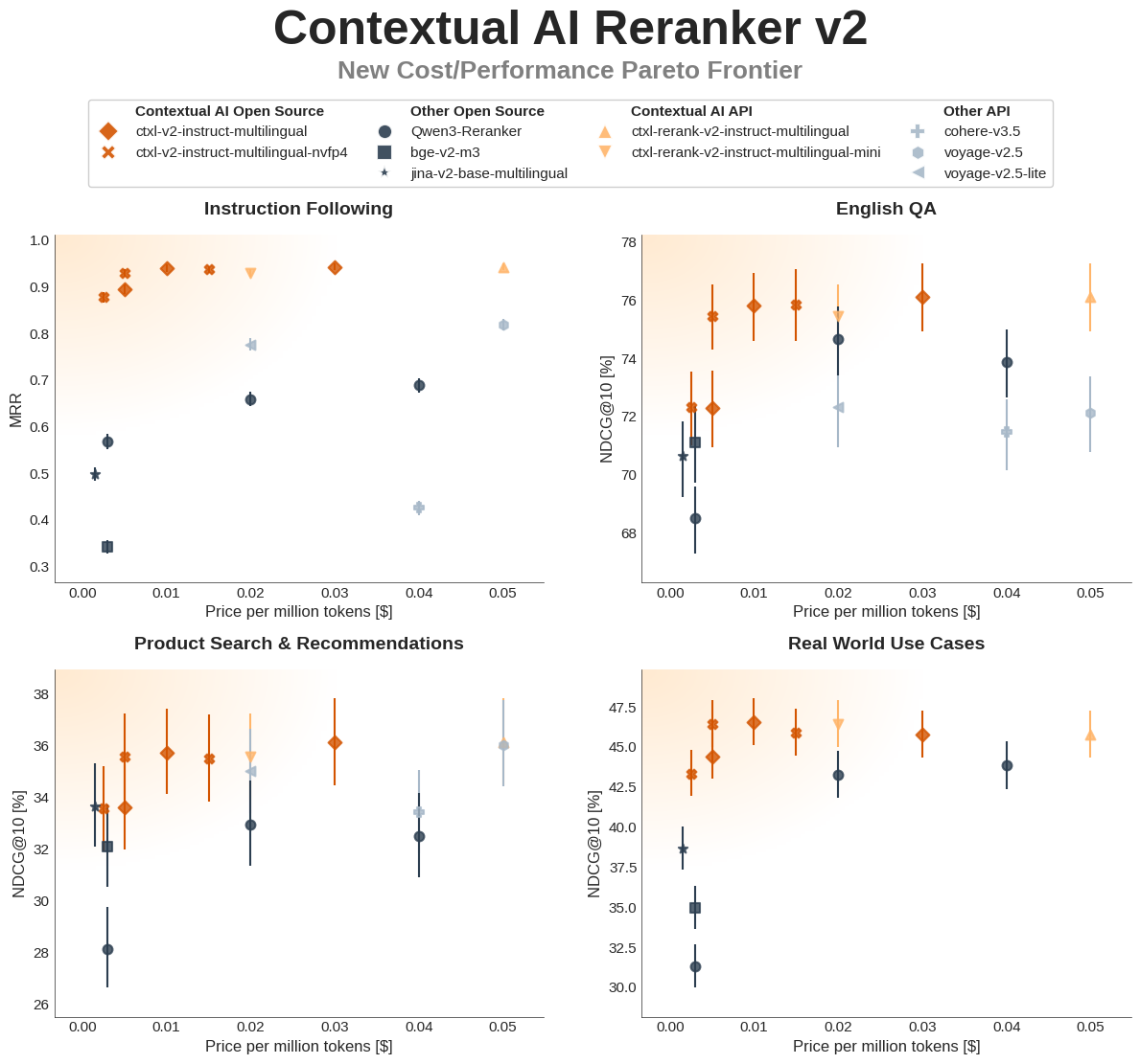 Contextual AI's reranker is the first instruction-following reranker capable of handling retrieval conflicts and ranking with custom instructions (e.g., prioritizing recent information). It achieves state-of-the-art performance on BEIR and sits on the cost/performance Pareto frontier across: