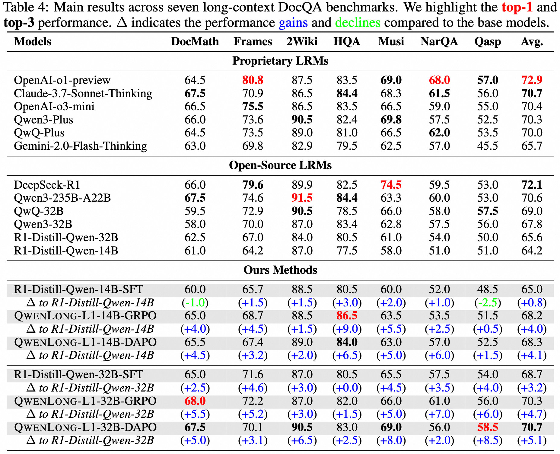 May 26, 2025: 🔥 We release 🤗 QwenLong-L1-32B, which is the first long-context LRM trained with reinforcement learning for long-context reasoning. Experiments on seven long-context DocQA benchmarks demonstrate that QwenLong-L1-32B outperforms flagship LRMs like OpenAI-o3-mini and Qwen3-235B-A22B, achieving performance on par with Claude-3.7-Sonnet-Thinking, demonstrating leading performance among state-of-the-art LRMs.