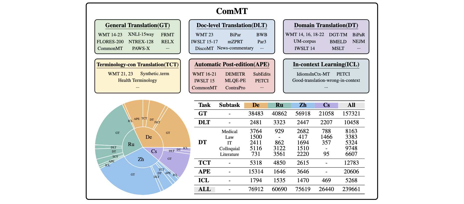 ComMT is a comprehensive dataset suite designed to support the development and evaluation of universal translation models. It includes diverse translation-related tasks, providing a well-curated data resource for training and testing LLM-based machine translation systems.