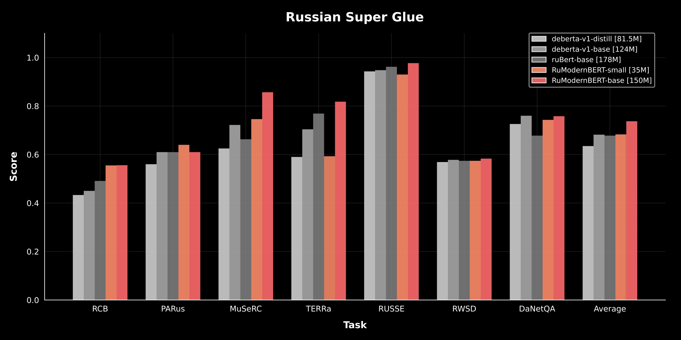 The Russian version of the modernized bidirectional encoder-only Transformer model, [ModernBERT](https://arxiv.org/abs/2412.13663).