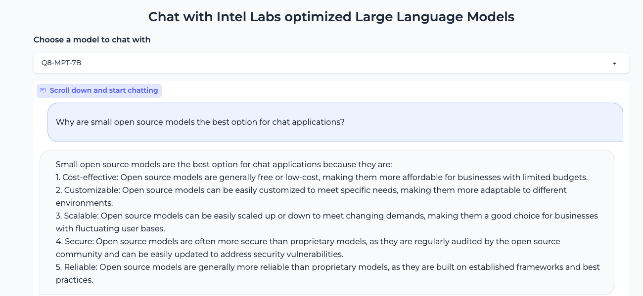 To get started with Intel hardware and software optimizations, download and install the Optimum Intel and Intel® Extension for Transformers libraries. Follow these documents to learn how to install and use these libraries: