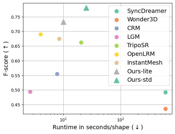 The lite model takes around 10 seconds to produce a 3D mesh from a single image on an NVIDIA A100 GPU, while the standard model takes roughly 25 seconds. The plot laid out in the lower right demonstrates that Hunyuan3D-1.0 achieves an optimal balance between quality and efficiency.