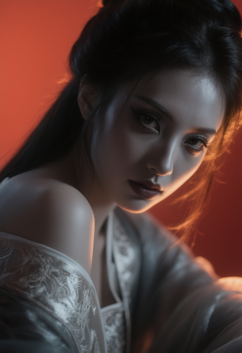 光线和氛围的营造是这幅杂志风海报的关键。一束暗橘色的柔和光线作为主光源,从人物的一侧斜上方投射下来,精准地勾勒出人物的脸颊、鼻梁和肩膀的轮廓,在皮肤上形成微妙的光影过渡。同时,人物的周身萦绕着一层暗淡且低饱和度的银白色辉光,如同清冷的月光,形成一道朦胧的轮廓光。这道银辉为人物增添了几分疏离的幽灵感,强化了整体暗黑风格的神秘气质。光影的强烈对比与色彩的独特搭配,共同塑造了这张充满故事感的特写画面。整体图像呈现出一种融合了古典元素的现代时尚摄影风格。