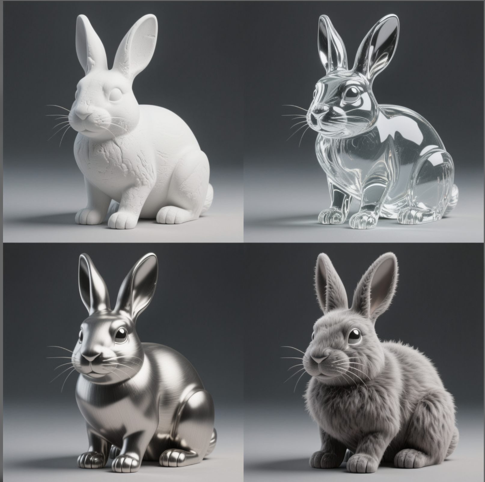 Show prompt 整体画面采用一个二乘二的四宫格布局,以产品可视化的风格,展示了一只兔子在四种不同材质下的渲染效果。每个宫格内都有一只姿态完全相同的兔子模型,它呈坐姿,双耳竖立,面朝前方。所有宫格的背景均是统一的中性深灰色,这种简约背景旨在最大限度地突出每种材质的独特质感。