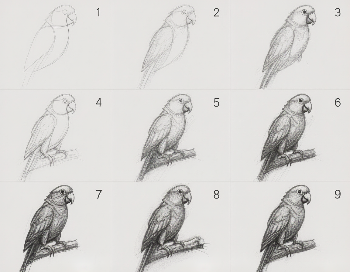 第三行则展示了最终的润色与完成阶段。左下角的第七个画框中,素描的排线更加密集,阴影层次更加丰富,羽毛的纹理细节被仔细刻画出来,眼珠也添加了高光点缀,显得炯炯有神;右上角标有数字“7”。中间的第八个画框里,描绘的重点转移到栖木上,增加了树枝的纹理和节疤细节,同时整体调整了鹦鹉身上的光影关系,使立体感更为突出;右上角标有数字“8”。右下角的第九个画框是最终完成图,所有线条都经过了精炼,光影对比强烈,鹦鹉的羽毛质感、木质栖木的粗糙感都表现得淋漓尽致,呈现出一幅完整且细节丰富的素描作品;右上角标有数字“9”。