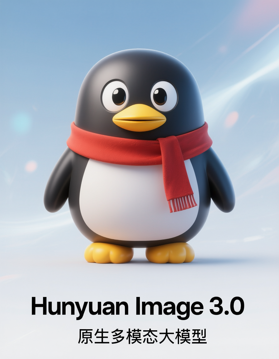海报的背景是一种从上到下由浅蓝色平滑过渡到白色的柔和渐变,营造出一种开阔、明亮的空间感。在企鹅的身后,散布着一些淡淡的、模糊的圆形光斑和几道柔和的抽象光束,为这个简约的平面设计海报增添了微妙的深度和科技感。